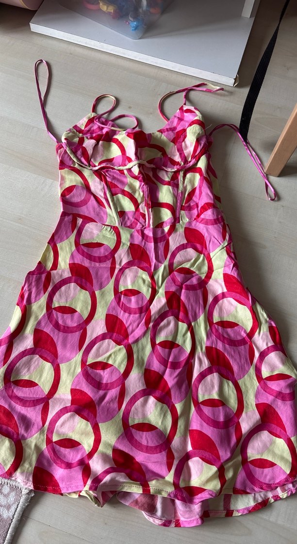 Pembe tonlarında retro halka desenli, askılı ve drapeli, Sentetik yumuşak kumaştan, vücuda oturan kesimdedir.