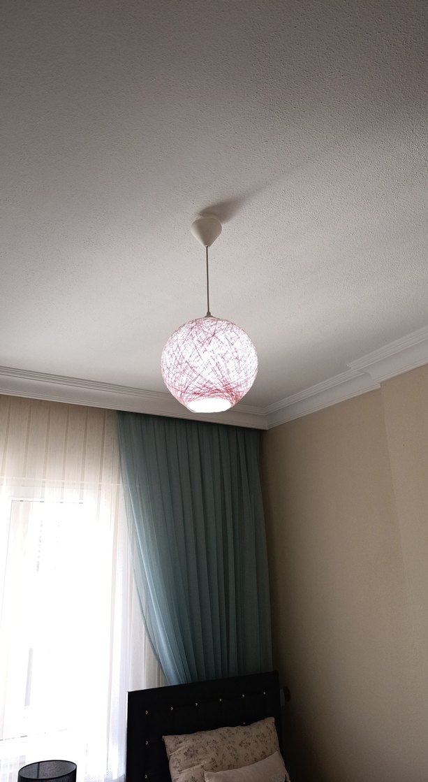 İnce pembe iplerle sarılmış yuvarlak tavan lambası, ortama yumuşak bir ışık sağlar.