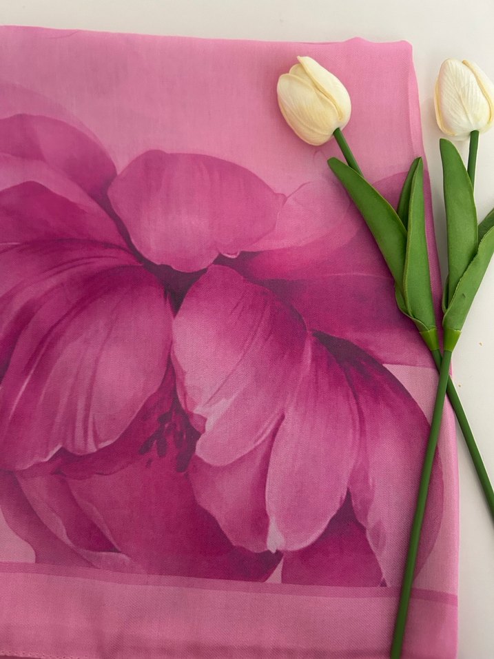 Kadın şal, ipek görünümlü yumuşak dokusu ve drapeli tasarımıyla pastel pembe renkte büyük çiçek desenine sahip. Minimalist, bohem ve retro tarzları yansıtıyor.
