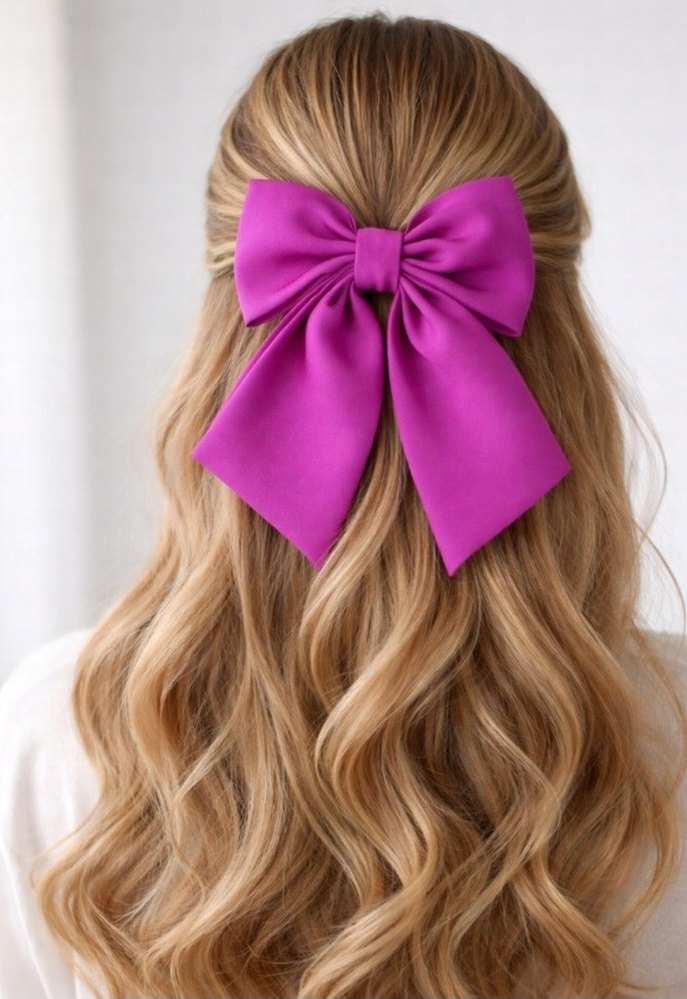 İpek görünümlü pembe fiyonk, cesur pop kültür tarzına sahip şık bir saç aksesuarıdır.
