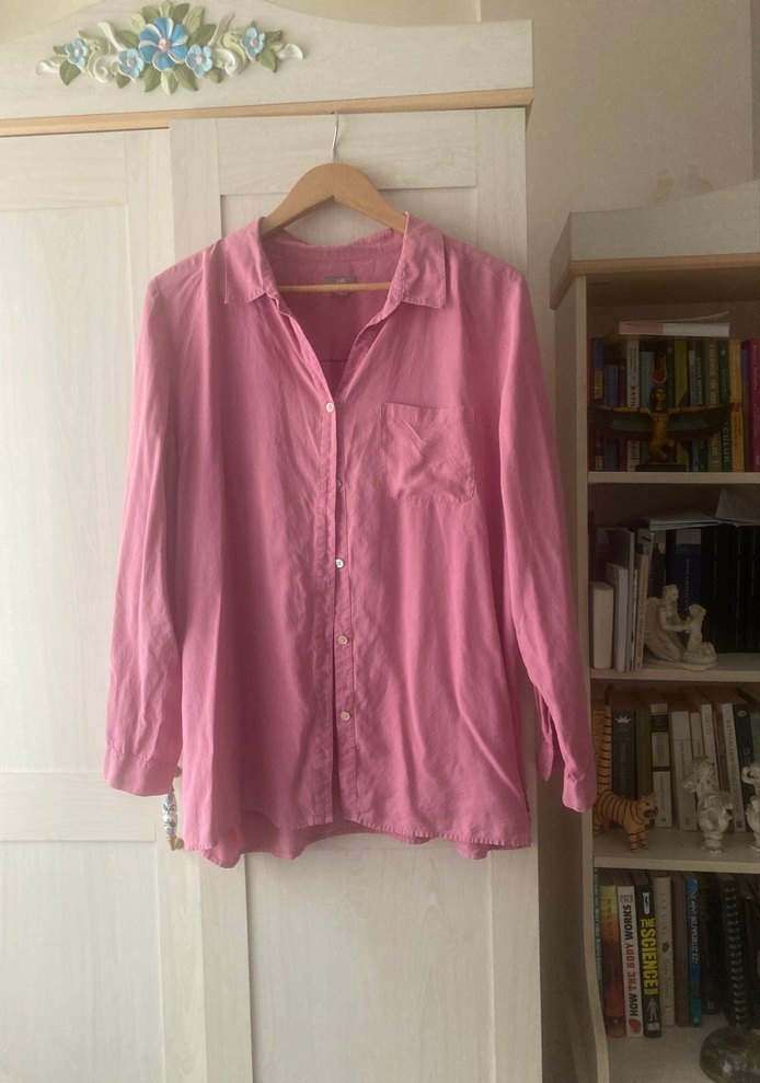 Düğmeli, yakalı, uzun kollu pembe keten gömlek. Rahat kesimi ve midi boyuyla günlük kullanıma uygundur. Amerika’dan aldım boyu 75 iki kol arası 62cm