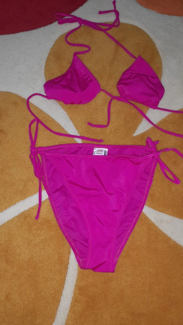 Pembe renkli, ipli askılı ve vücuda oturan bikini takımıdır. Renkli ve dikkat çekici tasarımıyla plajda rahat ve şık bir görünüm sunar.