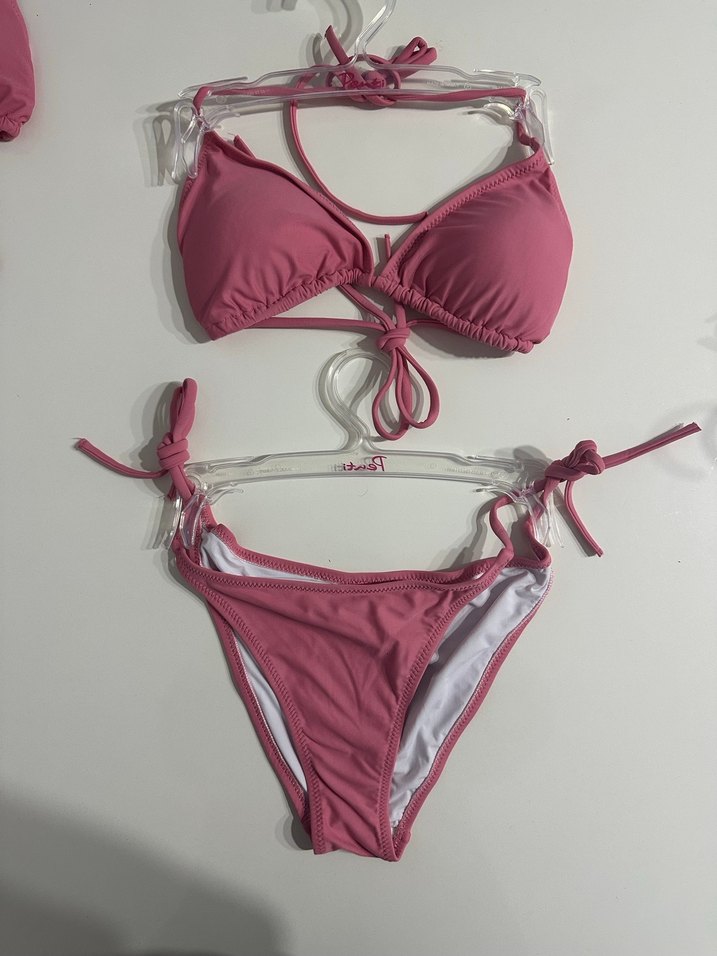 Pembe renkli, ipli detaylara sahip mini kısa kesim bikini, bohem tarzıyla cesur athleisure havasını birleştirerek plajda zahmetsiz şıklık sunar.