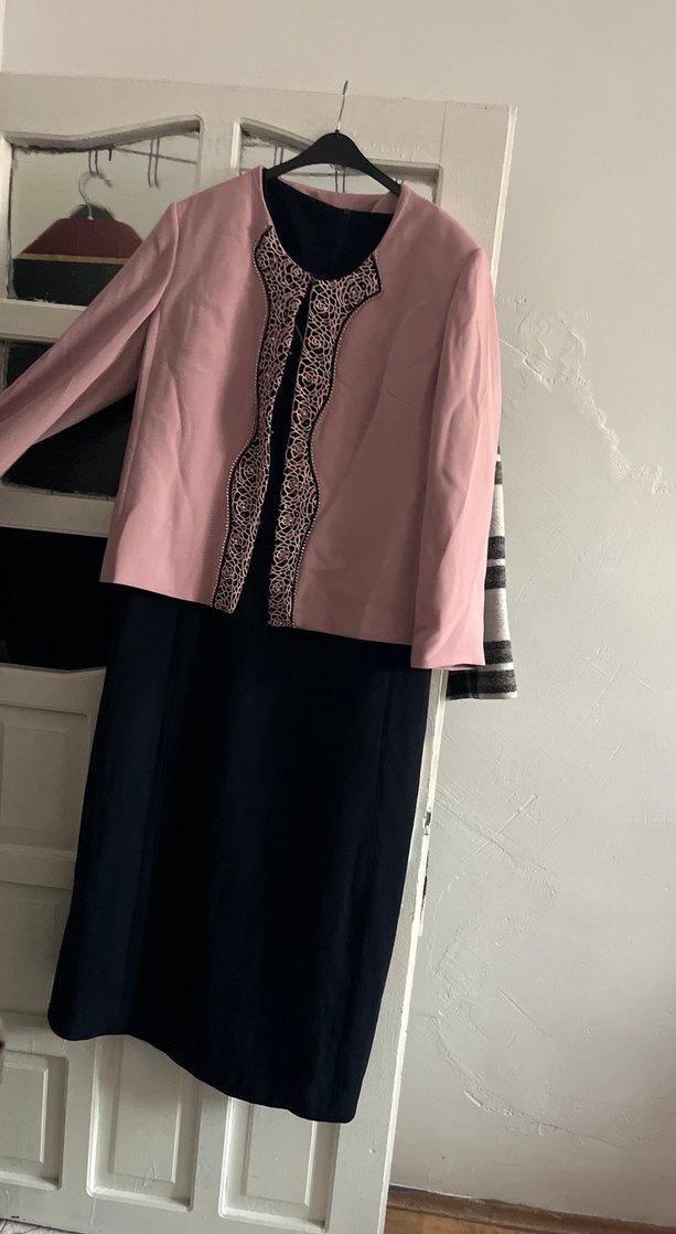Uzun, regular fit kadın takım elbise, düğmeli ve işlemeli koyu pembe saten ceket ile siyah elbiseden oluşur. Temiz ürün indirimi olur