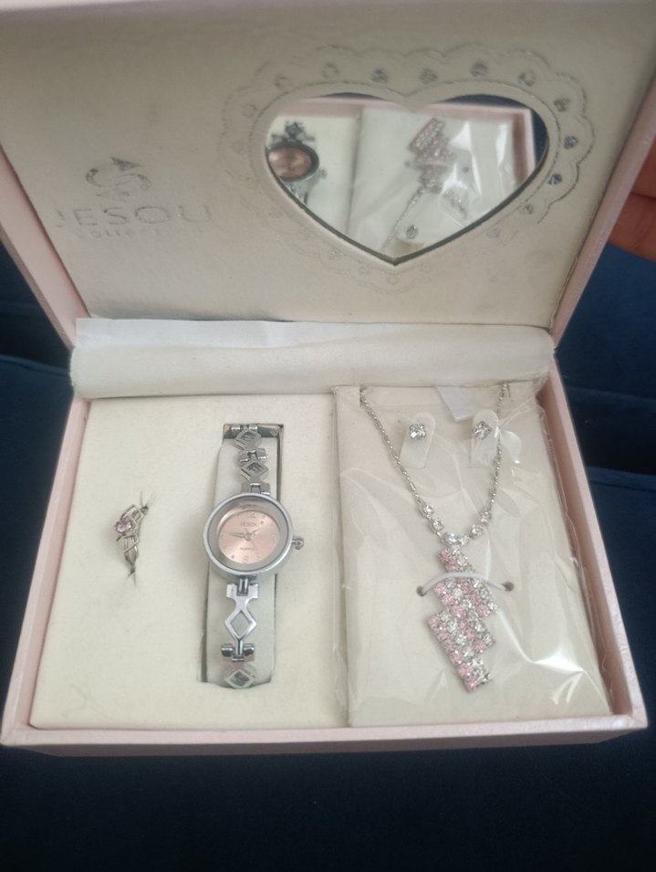 Pembe ışıltılı kadranlı kadın saati ve parlak taşlı takı seti, çağdaş ve klasik şıklığı bir arada sunar.