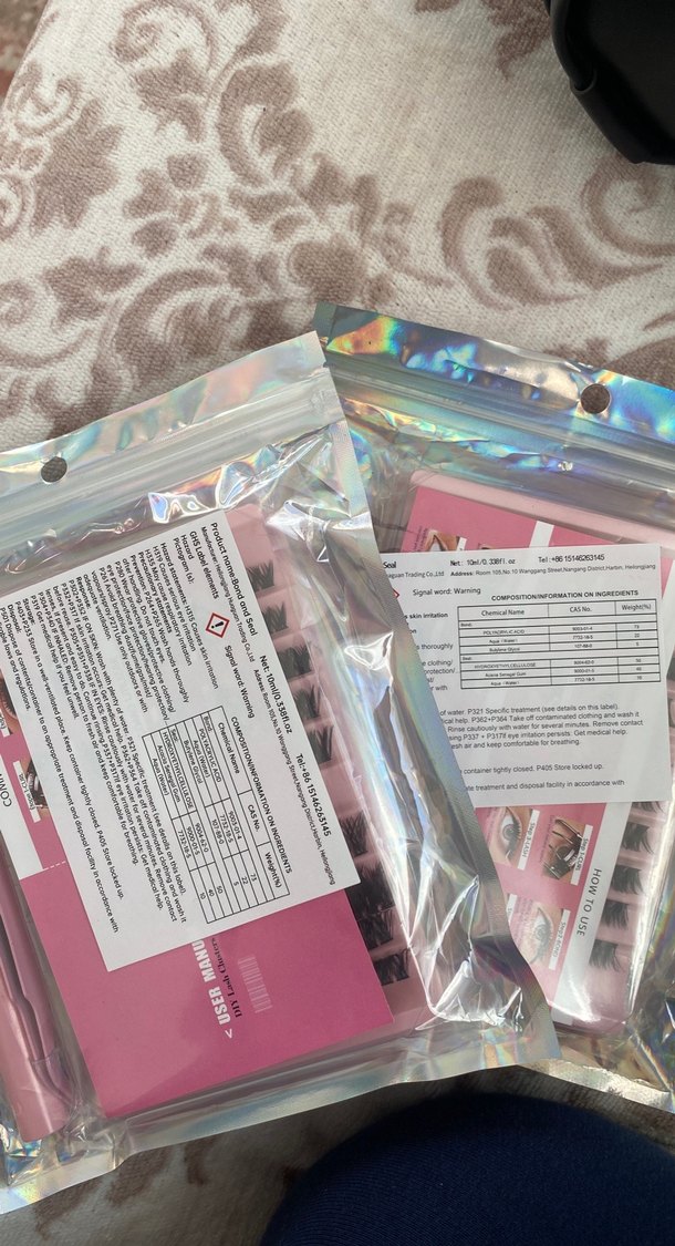Canlı görünümlü, açık pembe takma kirpikler. Yeniden kapatılabilir holografik poşetlerde, kullanım talimatları ve içerik bilgileri ile birlikte.