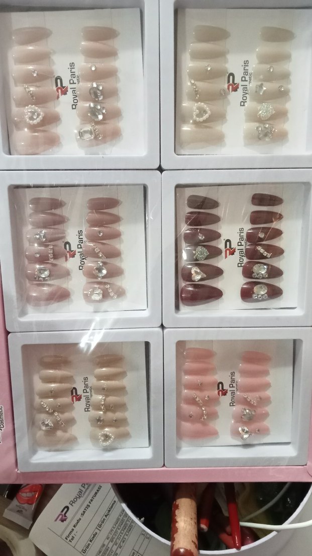 Işıltılı taş süslemeli açık pembe takma tırnak seti. Farklı boyutlarda tırnaklar mevcut.