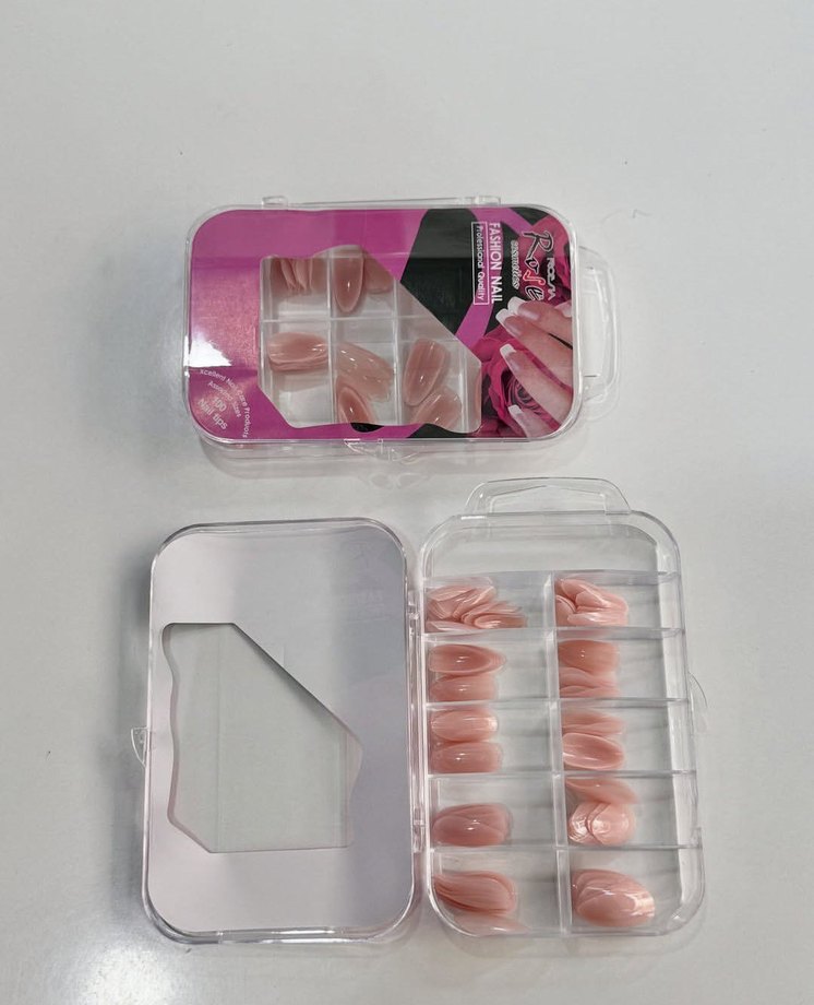 Şeffaf kutuda düzenlenmiş, parlak görünümlü açık pembe tırnak.