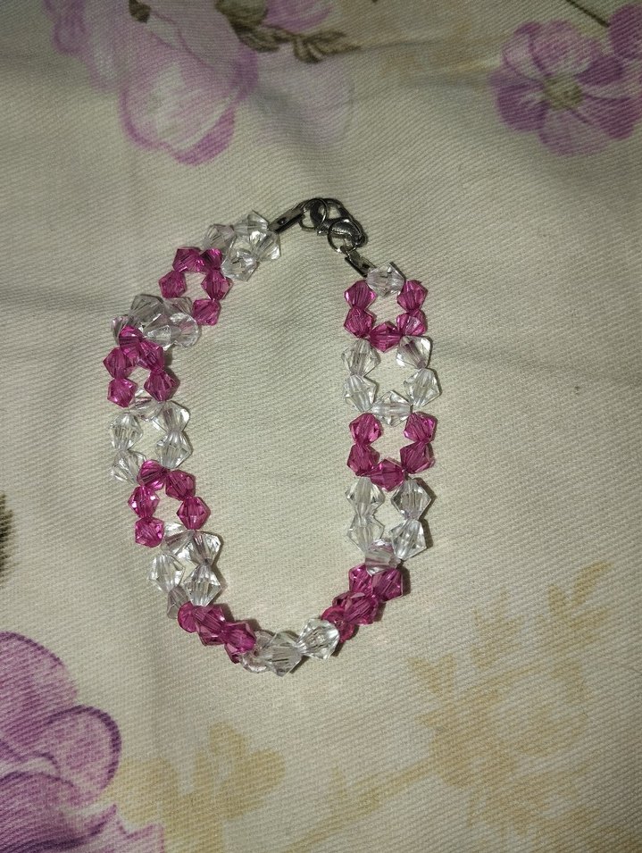 Pembe ve şeffaf boncukların işlemeli desende kullanıldığı, bohem ve gösterişli tarzda boncuklu bileklik. Düğünler için uygun.