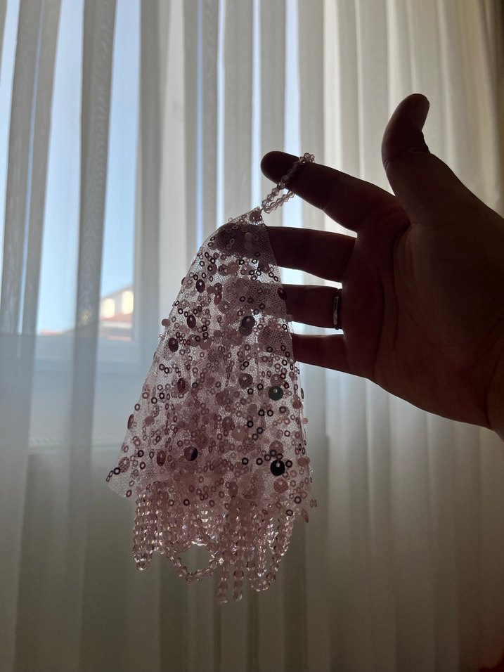 Parlak boncuklar ve işlemeli detaylara sahip pembe kadın el zinciri, avant-garde ve karşı kültür tarzını yansıtarak parti için uygundur. ✨