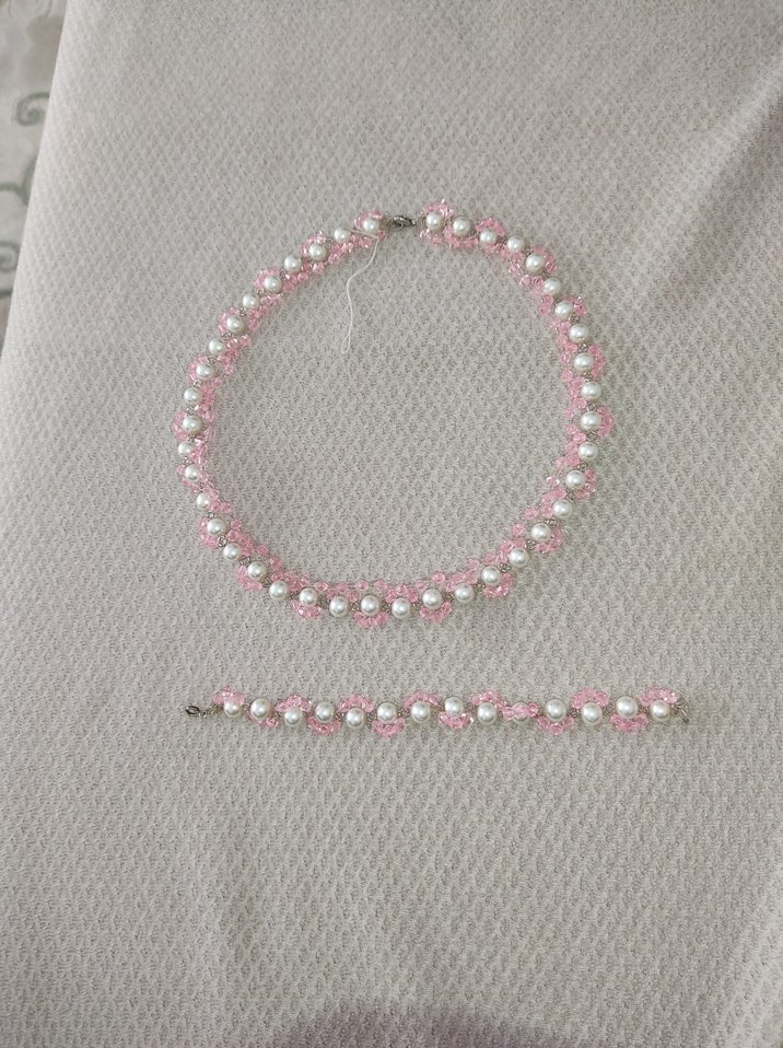 Pembe boncuklar ve işlemeli detaylarla kadın kolyesi. Pastel tonlarda, klasik ve minimal tasarıma sahip midi uzunlukta, günlük kullanıma uygun.