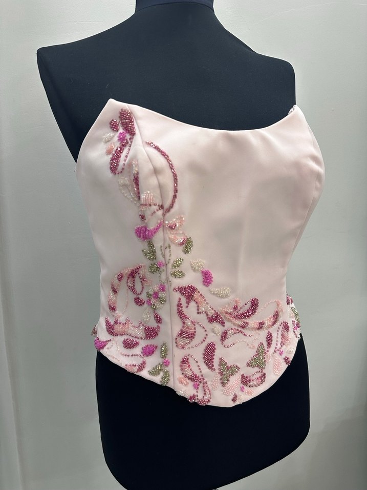 İnce işlemeli boncuk detaylı, straplez, pembe mini büstiyer, düğünler için uygun şık bir parça.