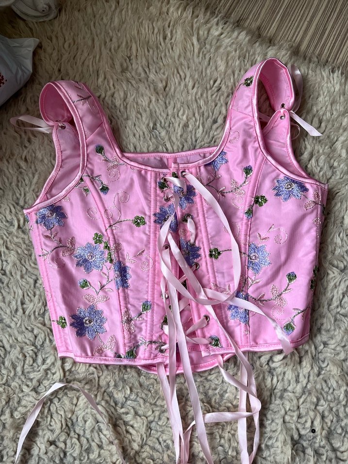 Pembe renkte, işlemeli çiçek desenli ve dantel detaylı, straplez yaka ve askılı, midi uzunlukta bohem tarzda fitted büstiyer.
