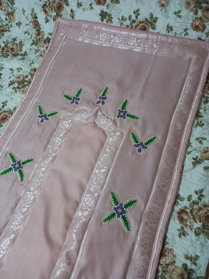 Pembe renkte, yeşil ve mor çiçek işlemeleriyle süslenmiş geleneksel desenli seccade. Çiçek desenli zarif bordür içerir. pudra renktir kaneviçe detaylıdır elyaflanmış astarlanmıştır yeni hazırlanmıştır isteğinize göre de hazırlanır #seccade #kaneviçe