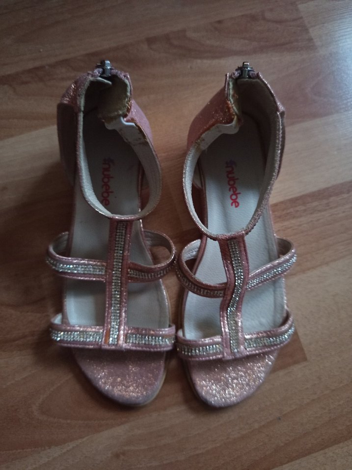 Pembe işlemeli, parlak yüzeyli abiye ayakkabı tokalı kayışlarla bohem tarzda tasarlanmıştır.