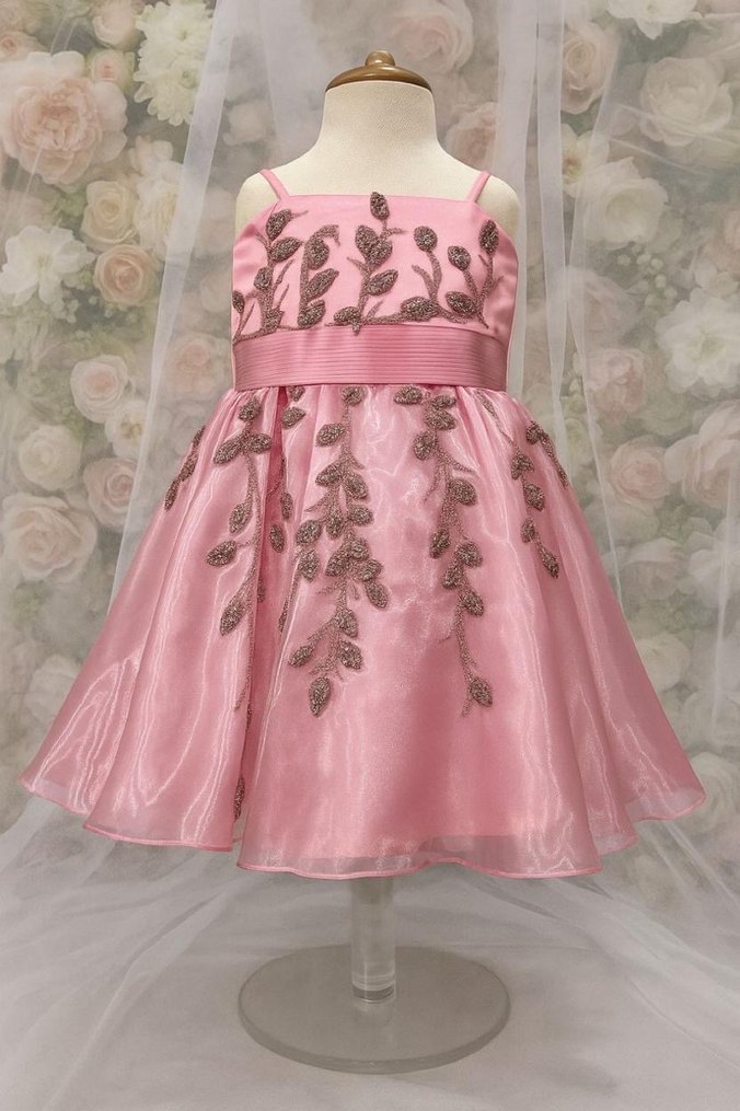 Parlak kumaşlı, işlemeli ve boncuk detaylı, askılı ve straplez yaka, klasik şıklıkta pembe kız çocuk elbisesi. 5-6 yaş arası uyumu kız çocuk elbise. Göğüs çevresi 60 santim beden uzunluğu 24 santim etek boyu 40 santim. Bedenin arkasında iki ila dört santim arasında pay mevcuttur.