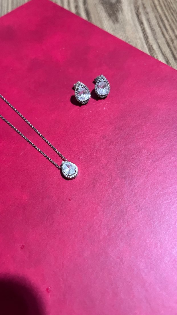 Minimalist tarzda, işleme detaylı ve parlak pembe renkli kolye ve küpe seti, romantik akşamlar için uygundur. Hepsi bir gönderim