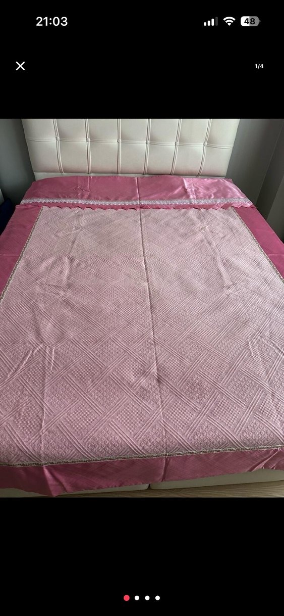 Pembe renkli yatak örtüsü, işlemeli deseni ve parlak dokusuyla odanıza zarif bir hava katıyor. Hic kullanilmadi. 150x200