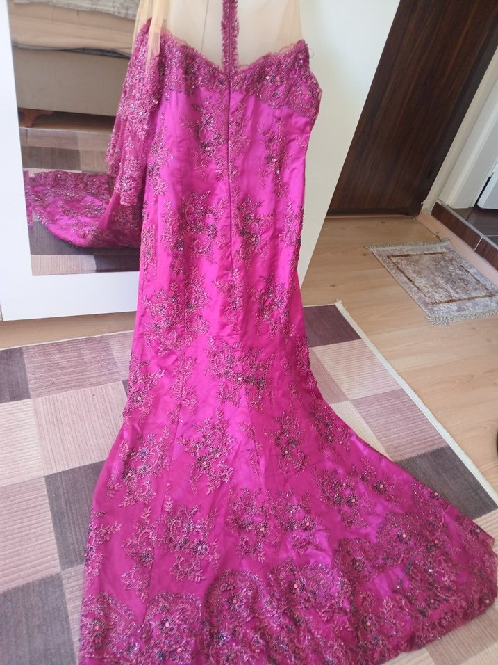 Pembe işlemeli uzun abiye elbise, drapeli tasarımı ve tekne yakası ile klasik şıklık sunar. Kolsuz ve düzenli kesimdir, özel davetler için uygundur. ✨