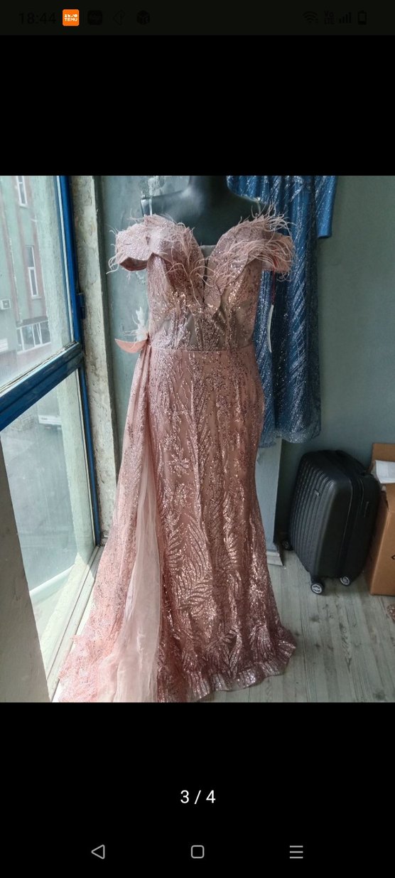 Pembe parlak işlemeli, drapeli uzun abiye elbise. Kayık yaka, kolsuz ve regular fit. Bohem tarzda, düğün için uygun.