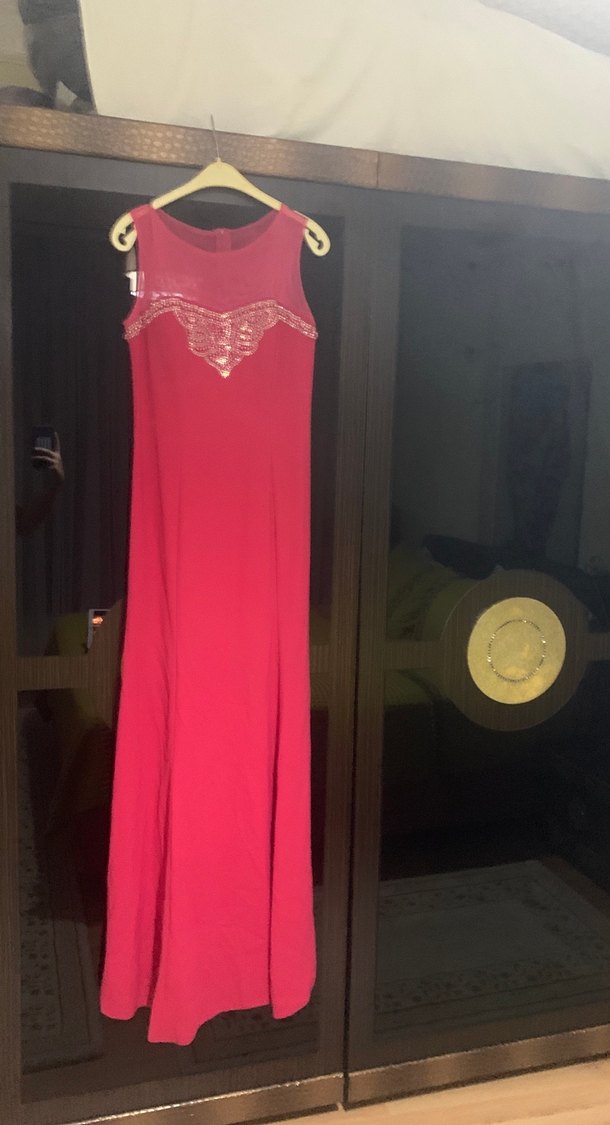 Pembe, uzun, kolsuz ve v yaka kesime sahip bu abiye elbise, işlemeli ve drapeli detaylarıyla parlak ve şık bir görünüm sunar. Göğüs 44 cm