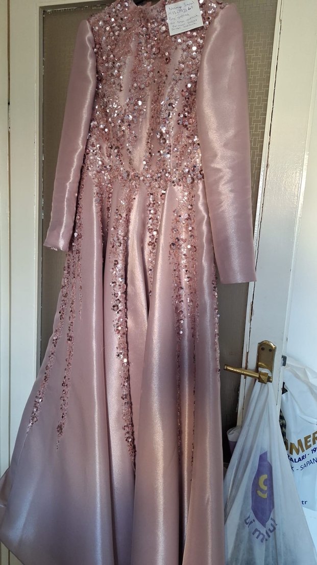 Bu uzun pembe abiye elbise, tekne yaka ve uzun kolludur. Düzenli kesim, drapeli parlak kumaş ve işlemeli desenlere sahiptir, nişanlık için uygundur. Çok beğenerek severek giydim. 38 ama 36 beden uyumludur. Ben 163 boy 52 kgyum. SADECE FİYAT 15 ARALIK 2025 TARİHİNE KADAR GEÇERLİDİR. Saç aksesuarı, yaka mendili, el mendili, kravat verilecektir.
