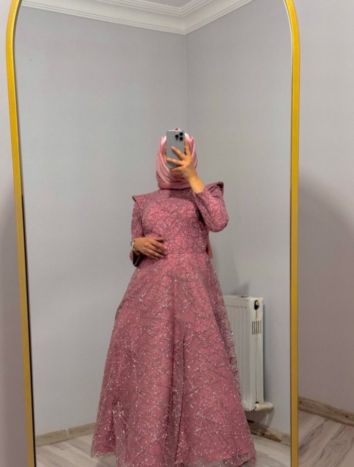 Pembe işlemeli, drapeli uzun ve dar kesim abiye elbise. Yüksek yakalı ve uzun kolludur, düğünler için uygundur.