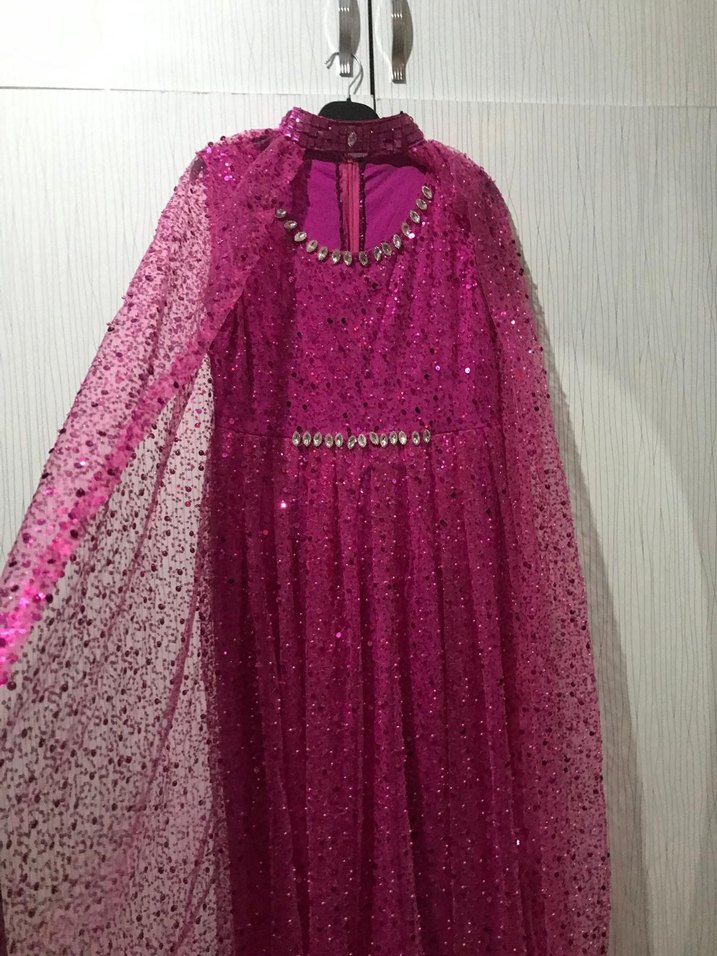 Pembe İşlemeli Uzun Kadın Abiye Elbise