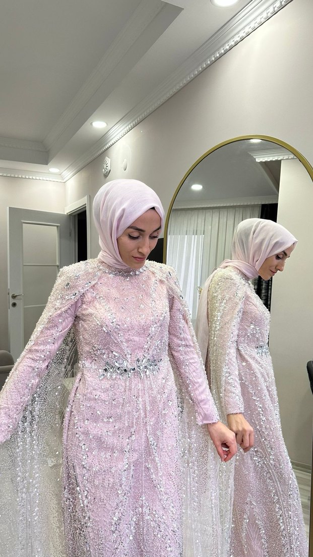 36-44 beden uyumlu şal dahil kiralık abiye✨ Açık pembe renkli, işlemeli ve drapeli uzun kollu abiye elbisedir. Düz kesim ve şık detaylarla düğün gibi özel günlere uygundur. ✨