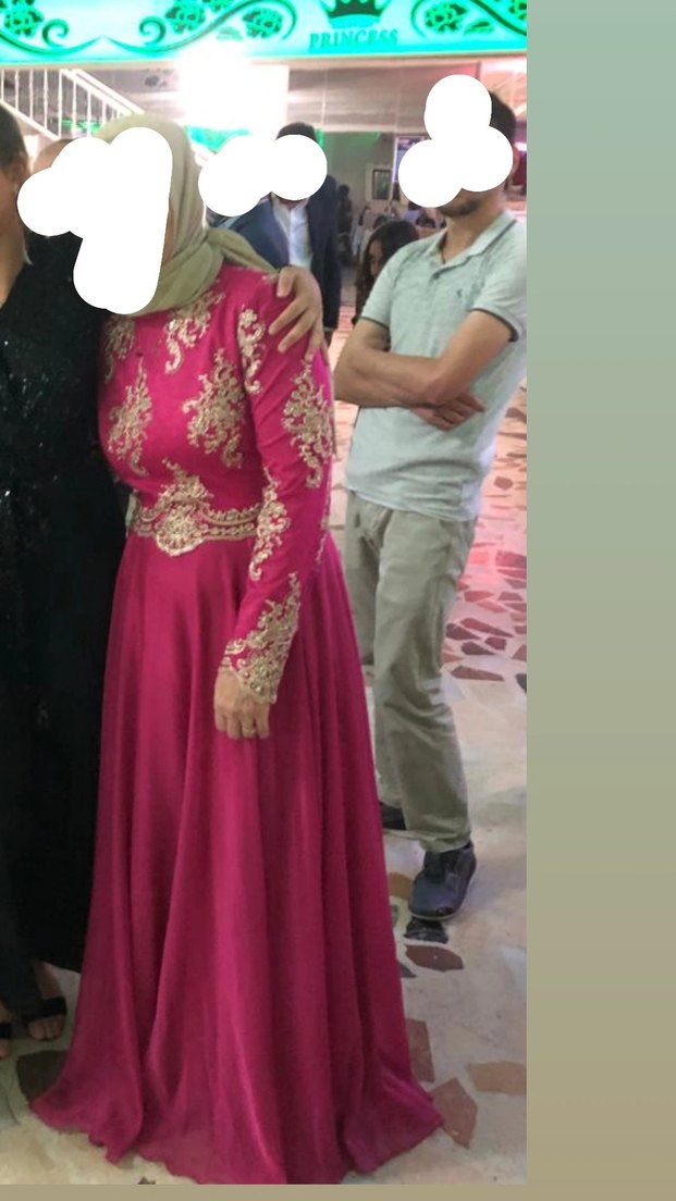 Pembe, işlemeli, yüksek yakalı ve uzun kollu, drapeli detaylara sahip, oturaklı ve gösterişli nişan elbisesi. 40 ila 42 beden icin uyumludur Çok Şık