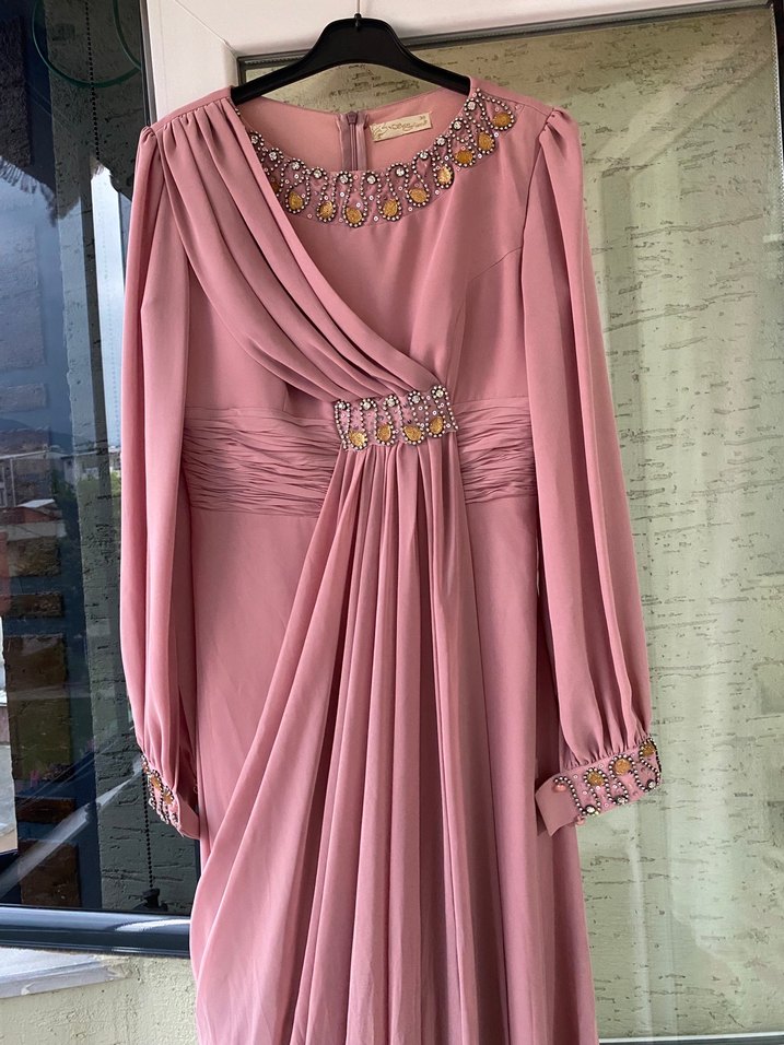 Pembe işlemeli, drapeli detaylı, uzun kollu, V yaka, bol kesim uzun abiye elbise, düğünler için uygundur.