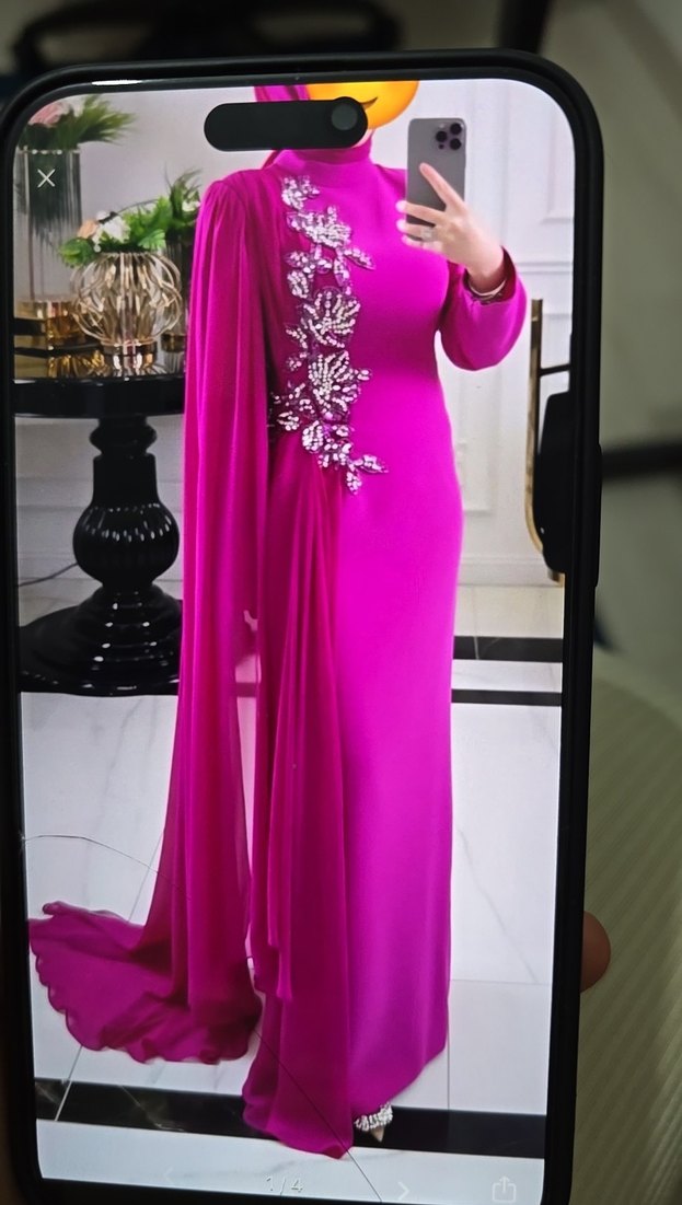 Pembe, işlemeli, uzun ve vücuda oturan bu abiye, yüksek yakalı ve kolsuz tasarımı ile düğünler için uygundur. ✨