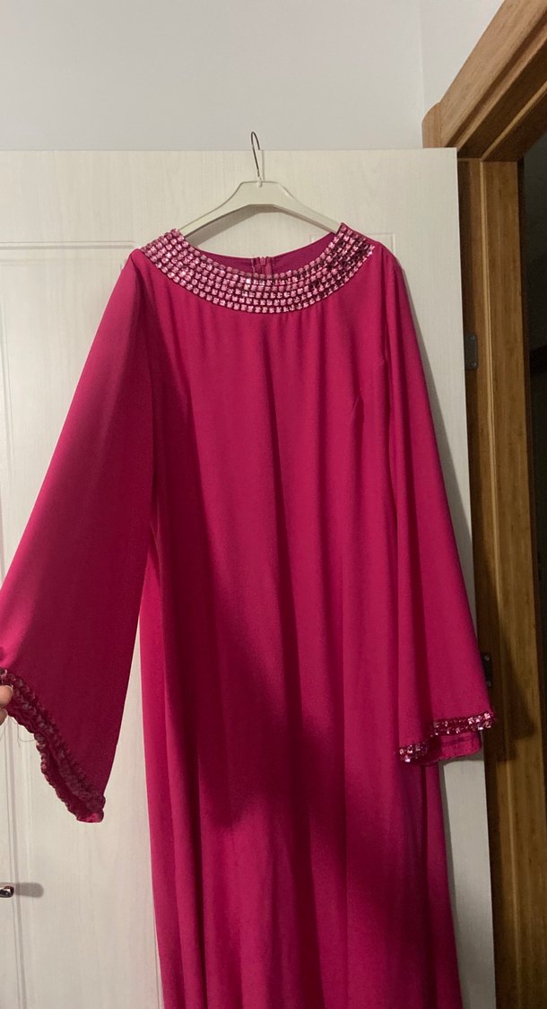Pembe işlemeli uzun kollu, yakası işlemeli ve bol kesim kadın elbisesi. Dökümlü, parlak sentetik kumaştan, düğünler için uygun. 52 beden hiç giyilmedi
