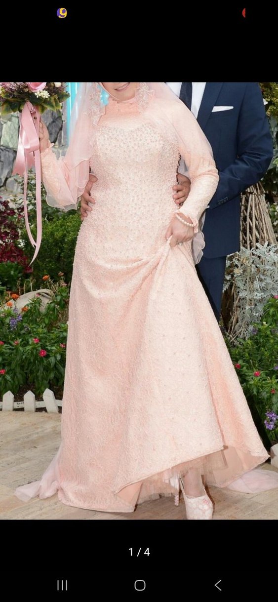 Bu pembe nişan elbisesi, uzun kollu ve straplez kesimlidir. İşlemeli ve drapeli tasarımıyla klasik ve göz alıcı bir görünüm sunar.
