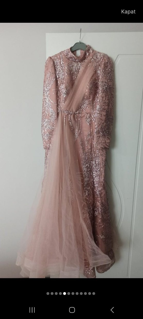 Pembe pastel tonlarında, işlemeli detaylara ve drapeli tasarıma sahip, V yakalı, uzun kollu ve vücuda oturan uzun abiye elbise. şal dahildir tekliflere açığız