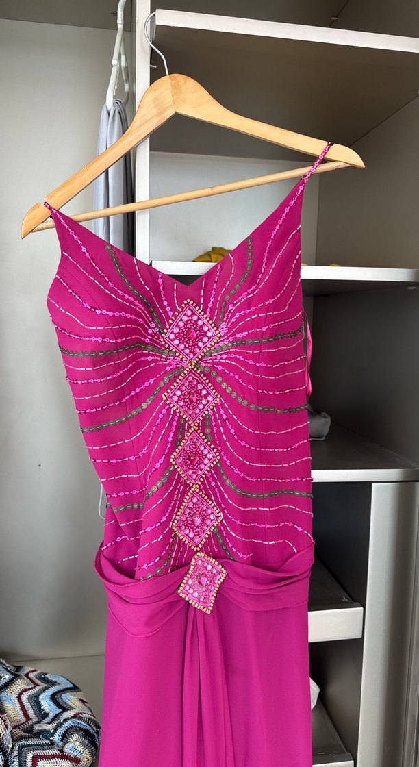 Pembe, işlemeli, V yakalı ve ince askılı uzun, drapeli, bohem tarzda, fit kesim abiye elbise. Parlak detaylarla süslenmiştir, gösterişli davetler için uygundur.