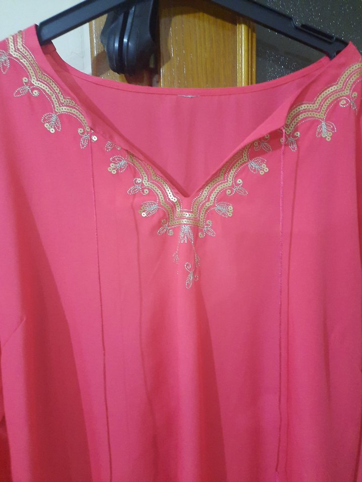 Uzun, bol kesim büyük beden tuniği, V yakalı ve drapeli ipeksi parlak pembe kumaştan, zarif işlemelerle süslenmiştir, düğünler için uygun.