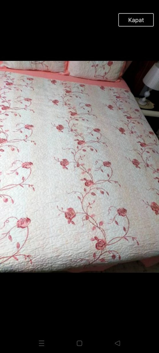 Pastel pembe işlemeli çiçek desenleriyle yumuşak dokulu yatak örtüsü, yatak odasına zarif bir dokunuş katıyor.