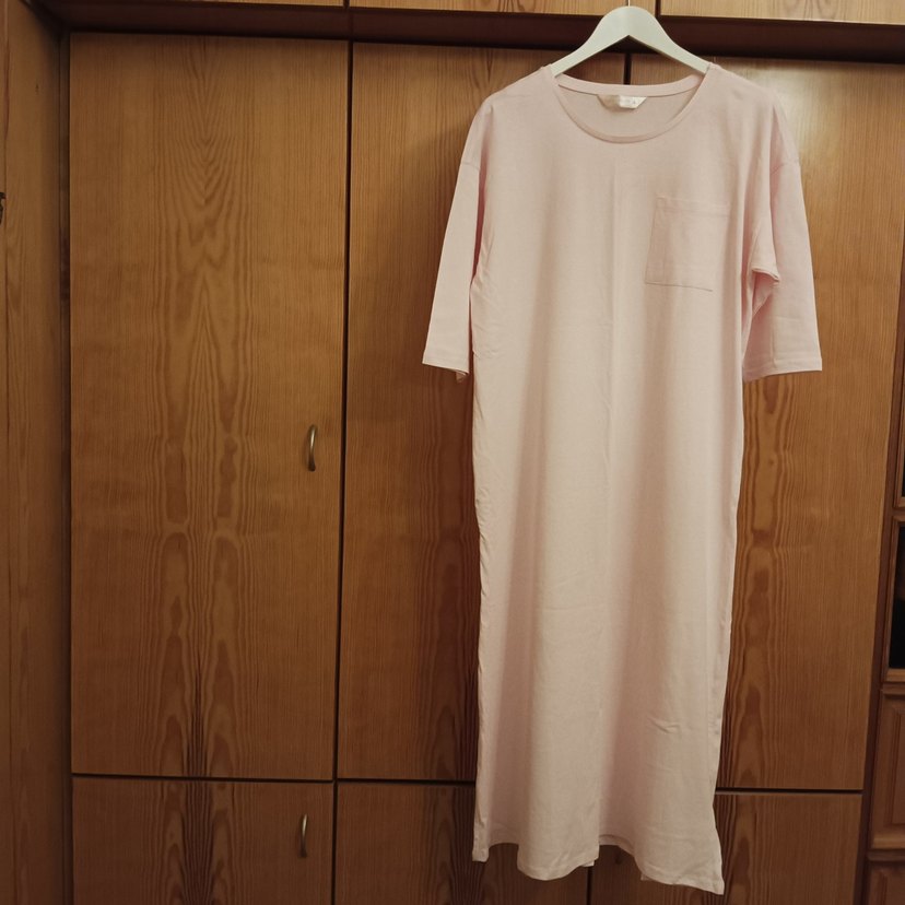 Bej pastel renkte, kısa kollu, yuvarlak yakalı, bol kesim uzun hamile ve emzirme geceliği. Yumuşak ve rahat kumaştan üretilmiştir.