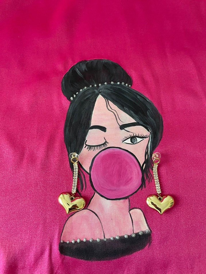 Pembe kabarcıklı kalp şeklinde küpeler, ışıltılı ve pop kültür esintili, rock punk tarzına uygun.