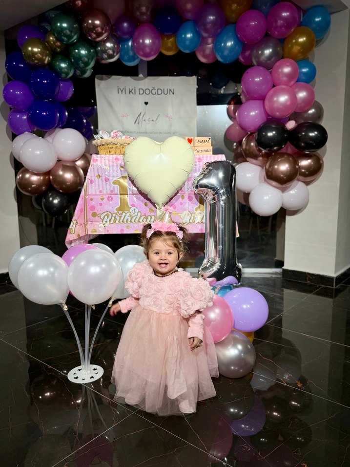 Pembe kabartmalı uzun kollu, kapüşonlu ve baskılı desenli, plastik görünümlü kumaştan yapılmış, trend bir çocuk elbisesi.
