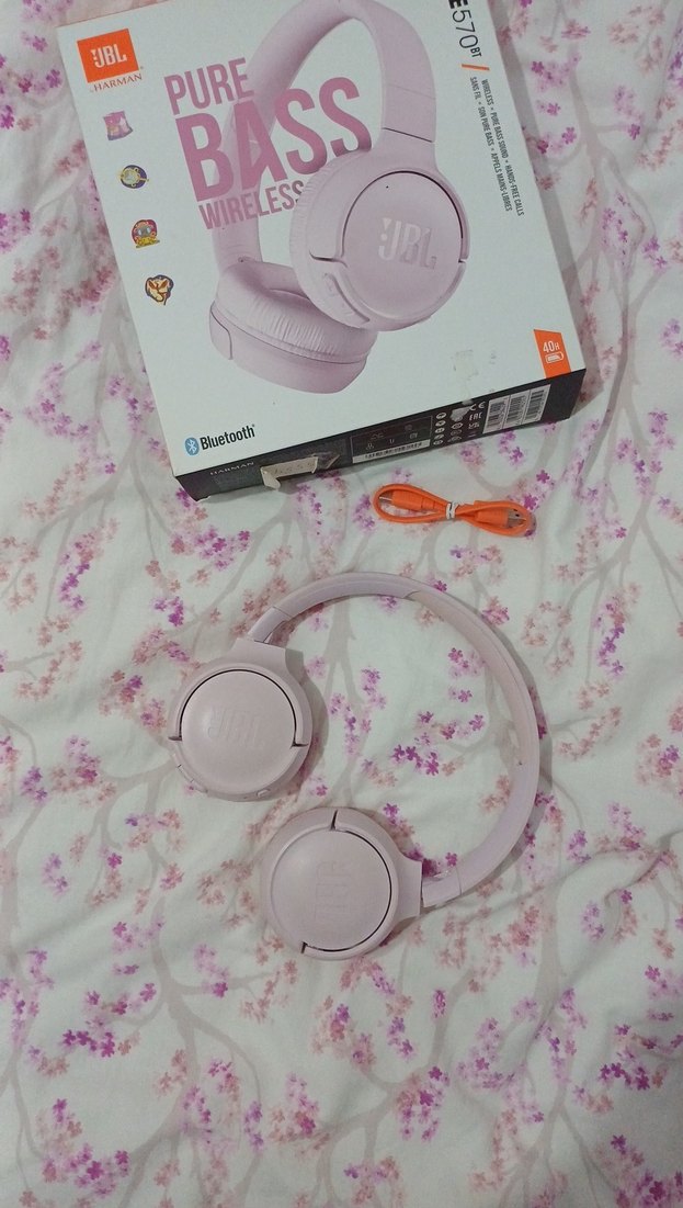 Pastel pembe renkli JBL kablosuz kulaklık, Bluetooth bağlantısı ve rahat kullanım sunar. Turuncu şarj kablosu dahil. bi kac kez kullandim sonra biraktim öyle dolapta duruyodu hicbir sıkıntısı yok çok severek kullandim ama müzik dinlemeye vaktim olmadigi icin satıyorum 570 bt
