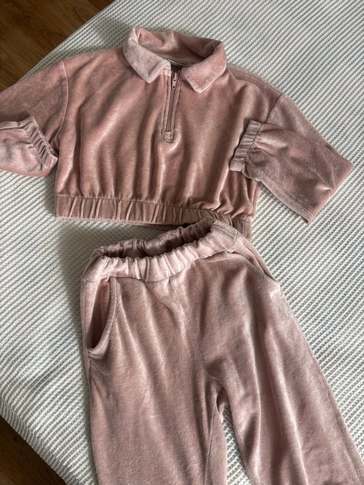 kadife kumaştan, bol kesim, yuvarlak yaka ve kürk detaylı eşofman takımı. Kızım zayıf olduğundan beline lastik takılmıştır.