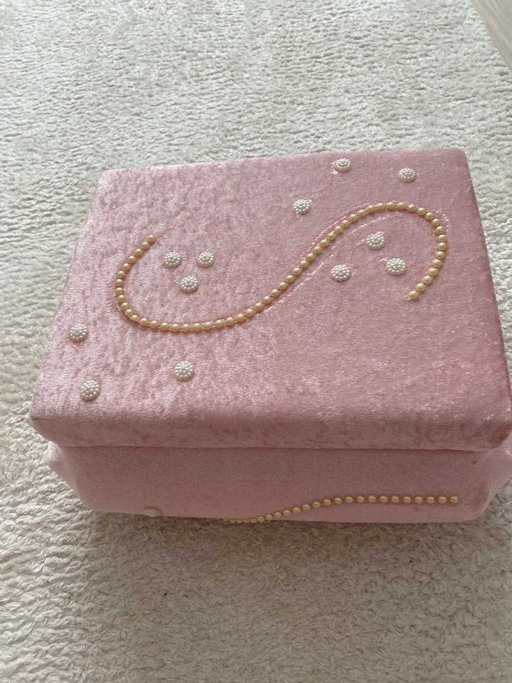 Yumuşak kadife dokulu, inci detaylı pastel pembe makyaj organizer kutusu. Makyaj malzemelerinizi düzenlemek için şık bir seçenek.