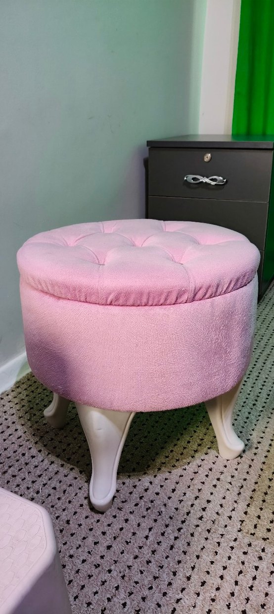 Pastel pembe kadife kaplamalı, düğme detaylı ve beyaz ayaklı taburesi.