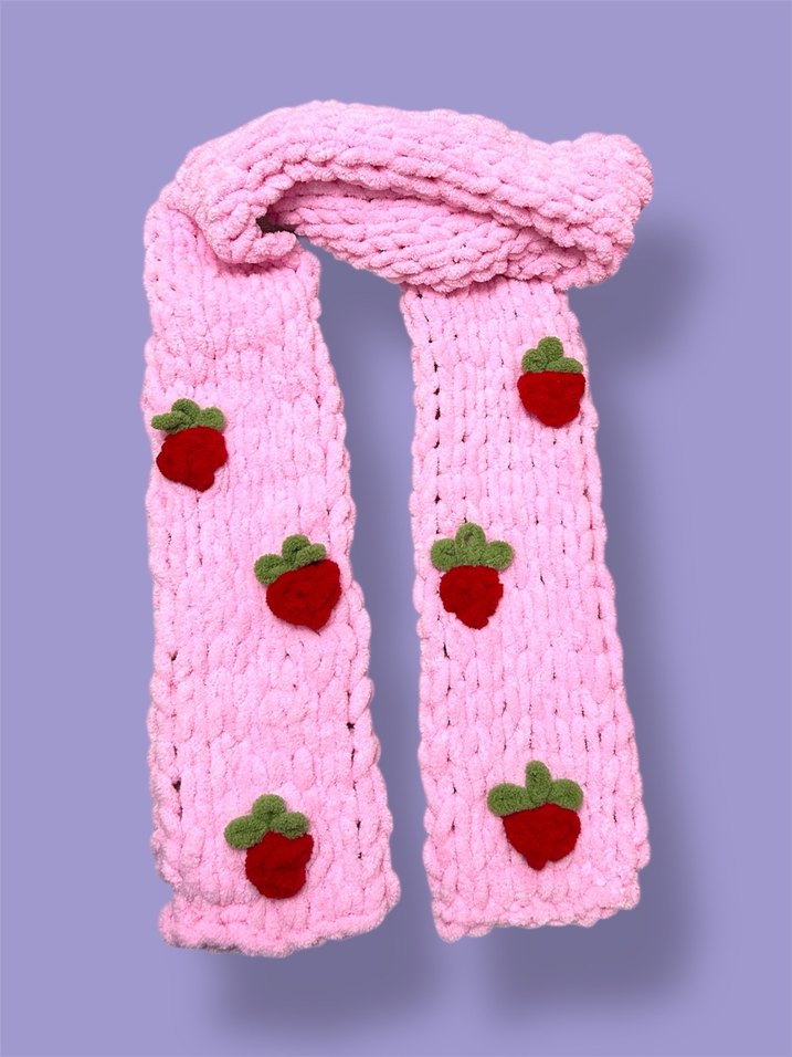 Pastel pembe örgü kadın şal, kırmızı çilek aplike detaylıdır. Yumuşak ve rahat dokulu, bohem tarzda bir şal.