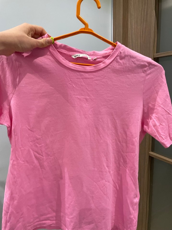 Pembe, yuvarlak yaka, kısa kollu, bol kesim tişört. Yumuşak sentetik kumaştan, günlük kullanım için uygun.