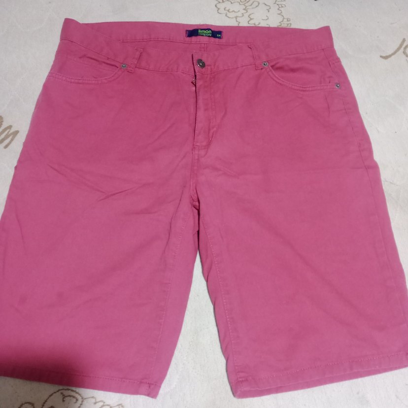 Pembe renkte, pamuk kumaştan yapılmış, düğmeli ve regular fit kesime sahip kadın bermuda şort, günlük rahat kullanım için uygundur.