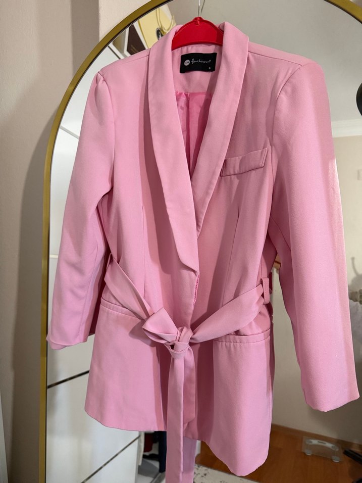 Kadın blazer, düğmeli ön, kuşaklı bel, kısa mini kesim, pastel pembe renk ve askılı kollara sahiptir. Sentetik kumaştan üretilmiştir, klasik şıklık ve ofis tarzı için uygundur.