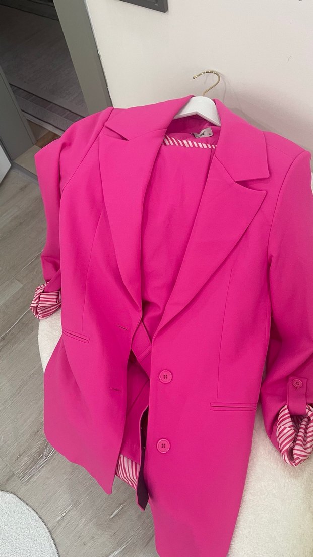 Pembe renkli, düğmeli, regular fit kadın blazer ceket. Ofis kullanımı için uygun, sentetik kumaştan üretilmiştir. Ceket pantolon takımdır